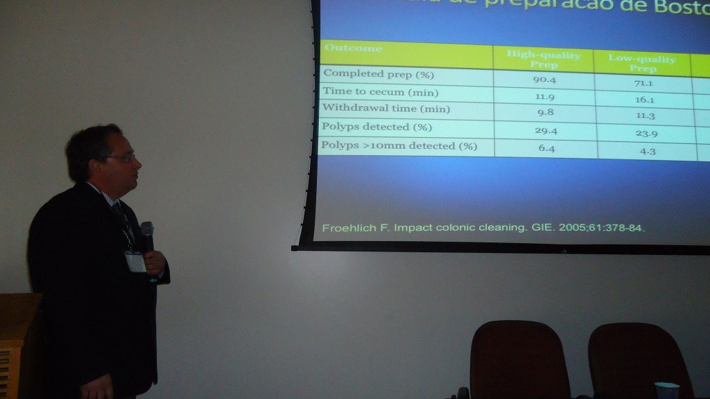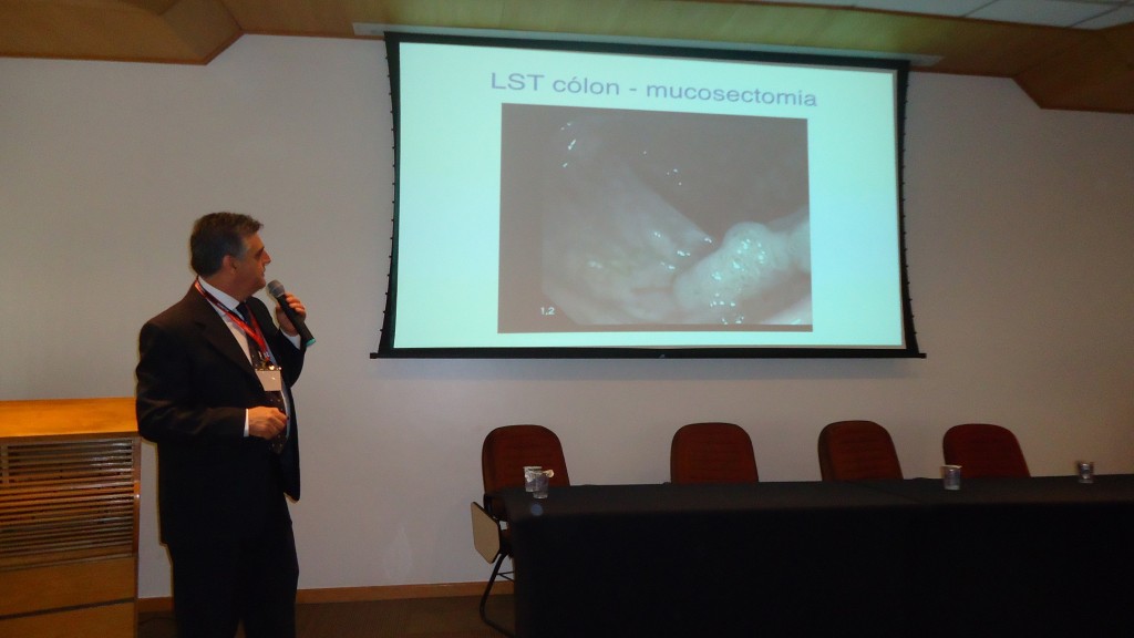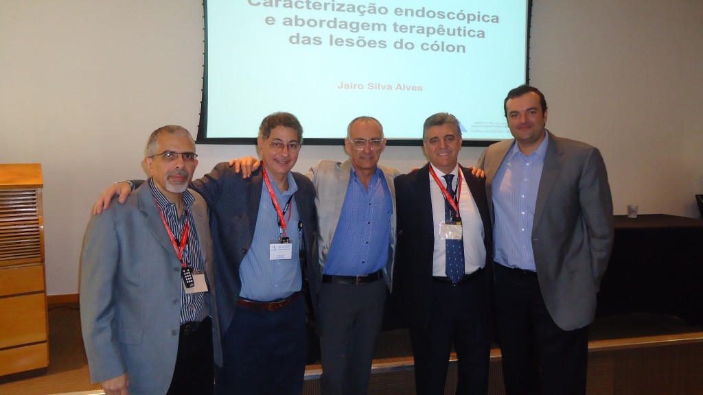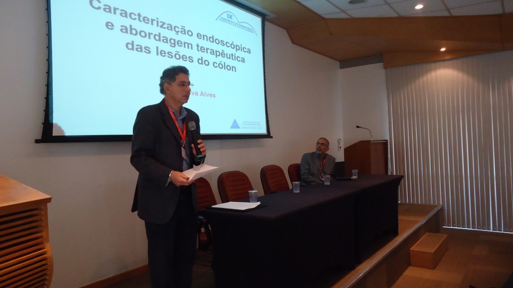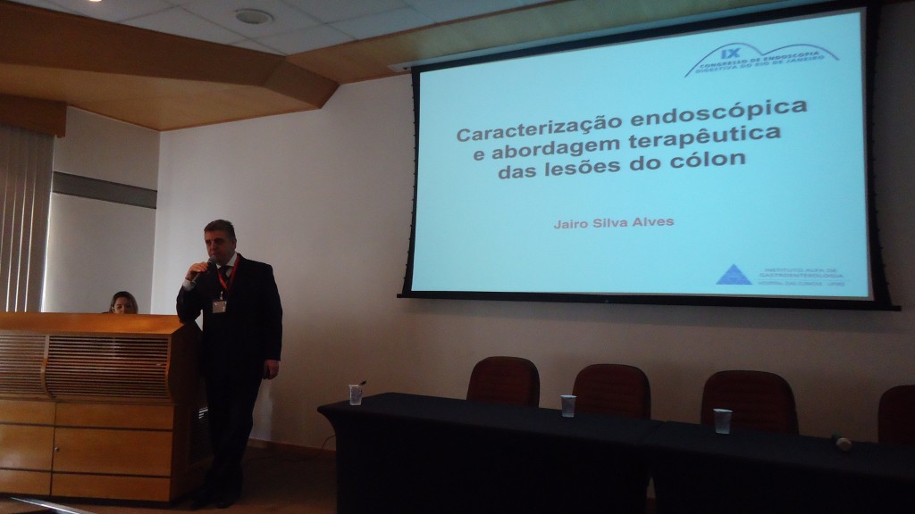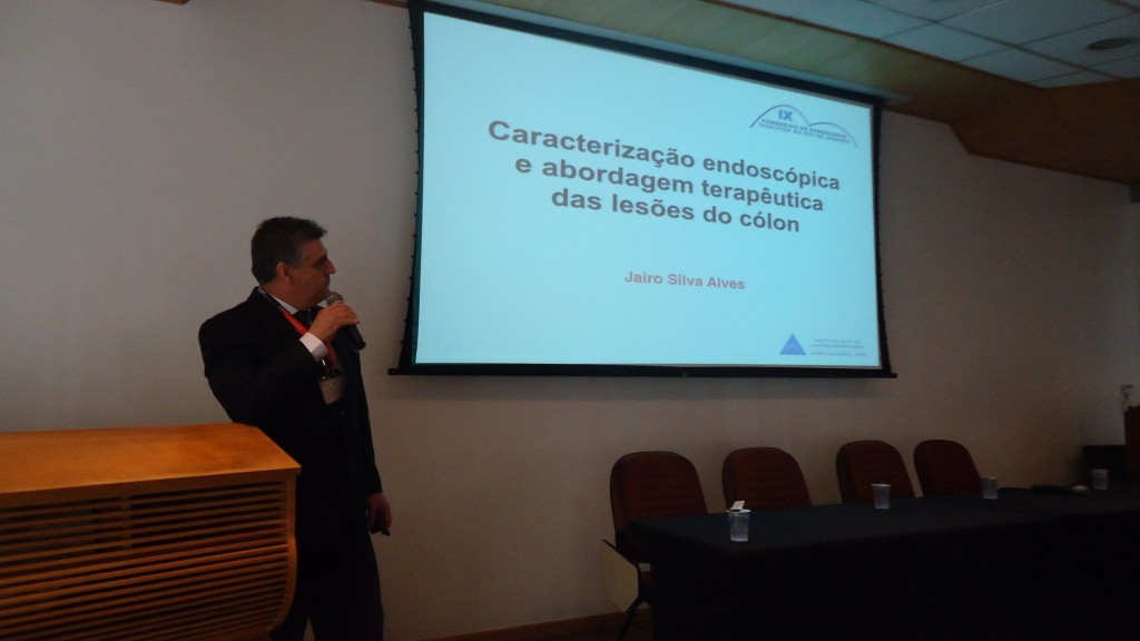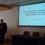 Em seguida, o Dr. Jairo Alves fez a primeira palestra do dia, sobre Caracterização endoscópica e abordagem terapêutica das lesões de cólon, respondeu a perguntas dos presentes e depois fez apresentação de casos clínicos, com vídeos, sobre o tema.