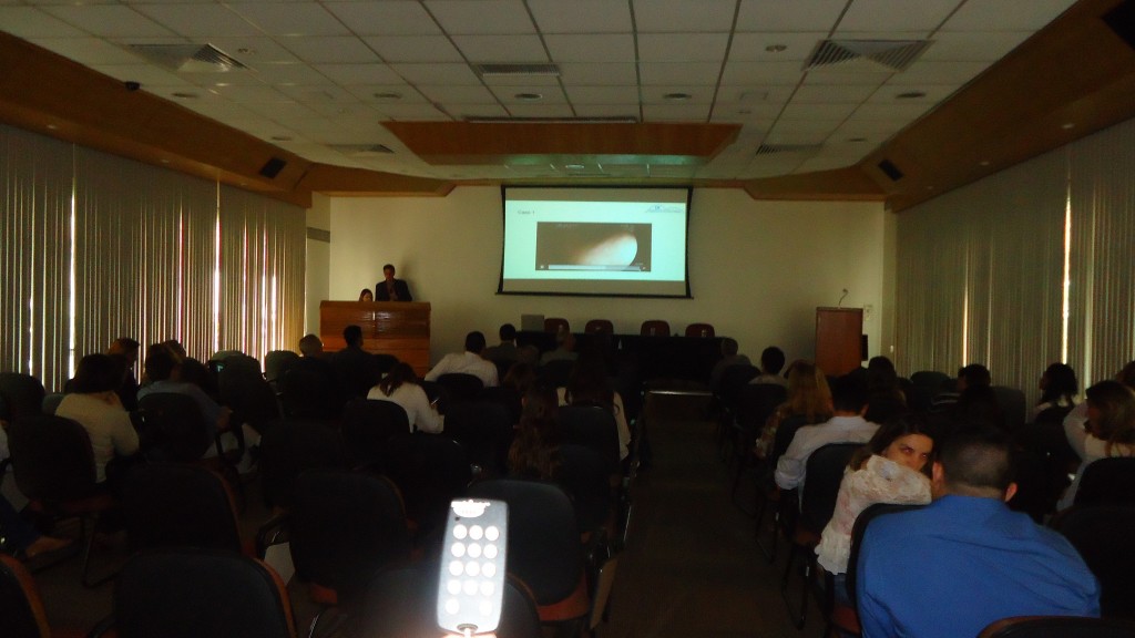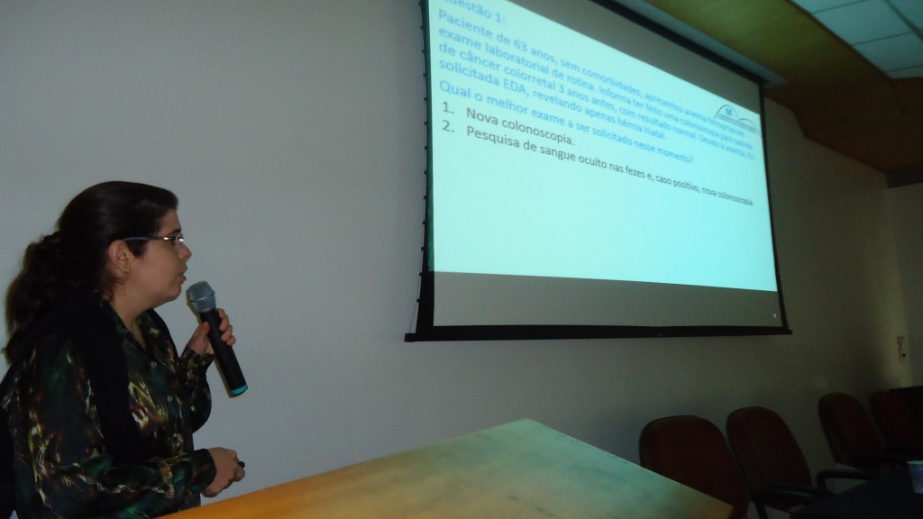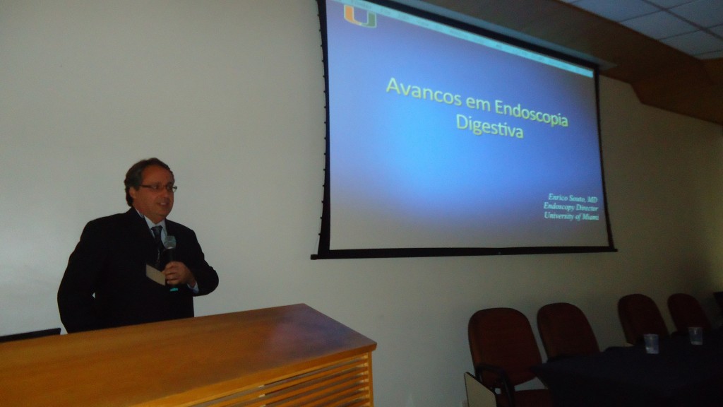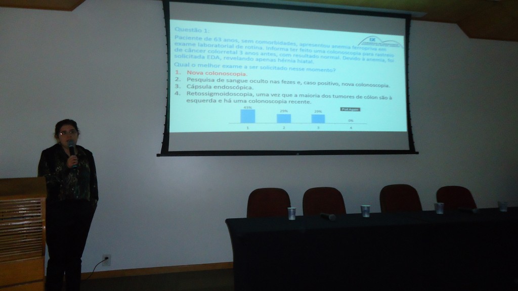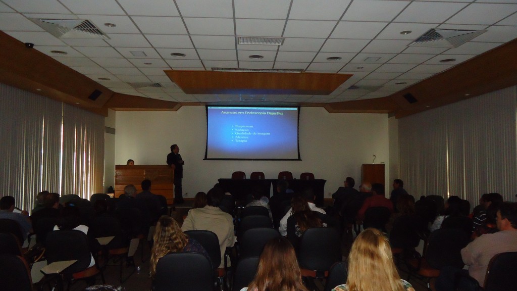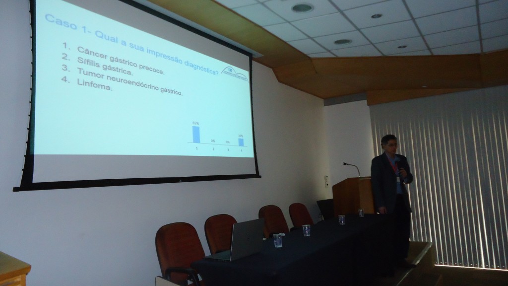 Na volta do almoço, devido a um atraso no voo do Dr. Enrico Souto, coube a Dra. Lilian Machado iniciar as atividades antecipando a sessão de Teste seus conhecimentos que só ocorreria no final do dia. Logo após, com a chegada do Dr. Enrico, foi a vez dele fazer sua palestra sobre Avanços em Endoscopia Digestiva. Depois do intervalo para o café, Dr. Enrico apresentou casos clínicos, com vídeos, para serem debatidos entre os presentes.