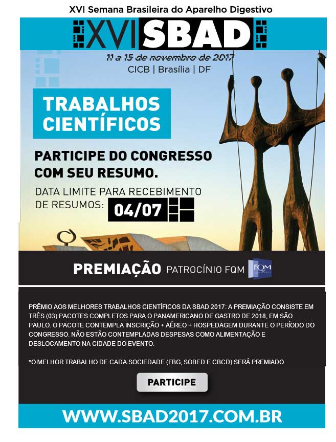 A XVI Semana Brasileira do Aparelho Digestivo acontece de 11 a 15 de novembro, em Brasília/DF. O maior e mais importante evento médico e científico do País sobre Aparelho Digestivo, prevê a participação de mais de 5 mil especialistas, vindos de toda a América Latina, que poderão contemplar uma programação voltada para intensa atualização e troca de experiência profissional.… SAIBA MAIS