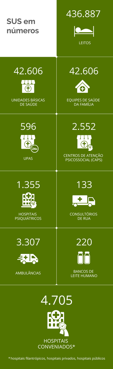A revitalização do Sistema Único de Saúde (SUS), responsável pelo atendimento exclusivo de cerca de 75% da população brasileira, hoje estimada em 208,5 milhões de pessoas, está entre os principais desafios do próximo presidente da República, juntamente com a segurança pública e a geração de empregos. Segundo dados do Ministério da Saúde, o SUS é um dos maiores sistemas de saúde do mundo: em 2017 foram realizados 3,9 bilhões de atendimentos na rede credenciada.… SAIBA MAIS
