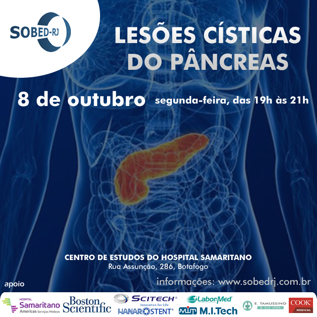 Na segunda-feira, dia 8, a SOBED-RJ realiza sua reunião científica de outubro, das 19h às 21h, que terá como tema Lesões Císticas do Pâncreas e ocorrerá no auditório do centro de estudos do Hospital Samaritano, em Botafogo.
