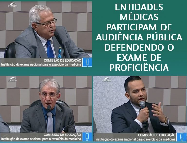 Audiência Pública sobre o Projeto de Lei do Senado n° 165, Exame Nacional Obrigatório de Proficiência em Medicina, foi realizada hoje (20/11) pela Comissão de Educação, Cultura e Esporte. Representando as entidades médicas estiveram presentes José Luiz Dantas Mestrinho, Vice-Presidente da Região Centro da Associação Médica Brasileira, Lúcio Flávio Gonzaga Silva, Coordenador da Comissão de Ensino Médico do Conselho Federal de Medicina e Juracy Barbosa, Presidente da Associação Nacional dos Médicos Residentes.… SAIBA MAIS