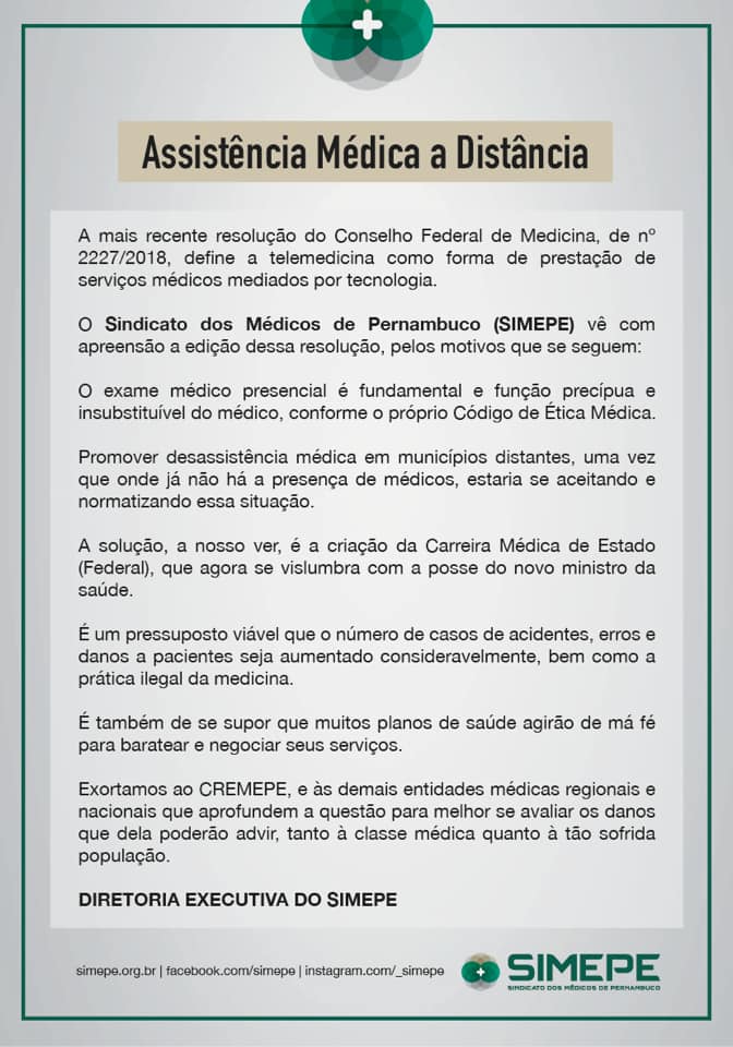 A nova resolução do CFM autorizando o uso da Telemedicina para consultas causou surpresa em muitas entidades médicas regionais, como o CREMERJ, o CREMESP e o SIMEPE.