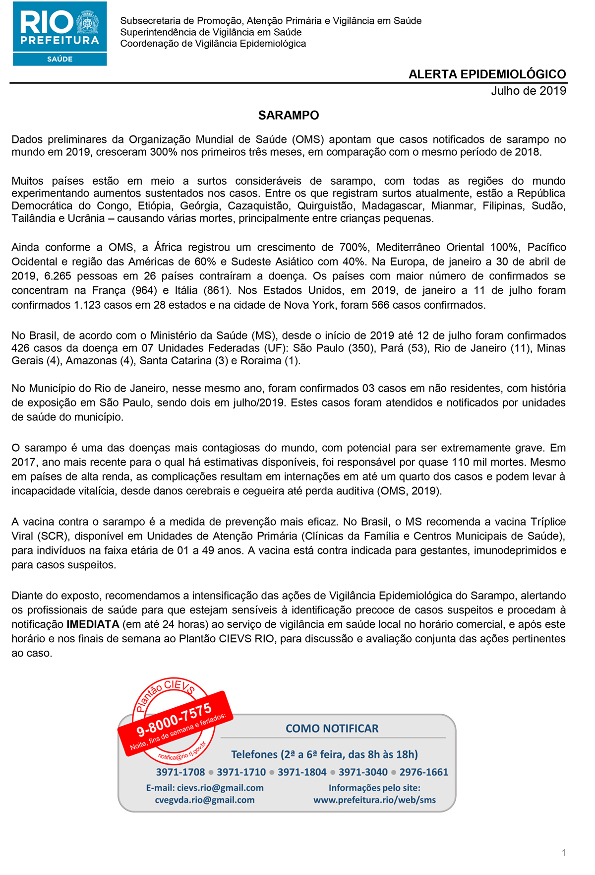• Prefeitura do Rio de Janeiro faz alerta epidemiológico sobre sarampo