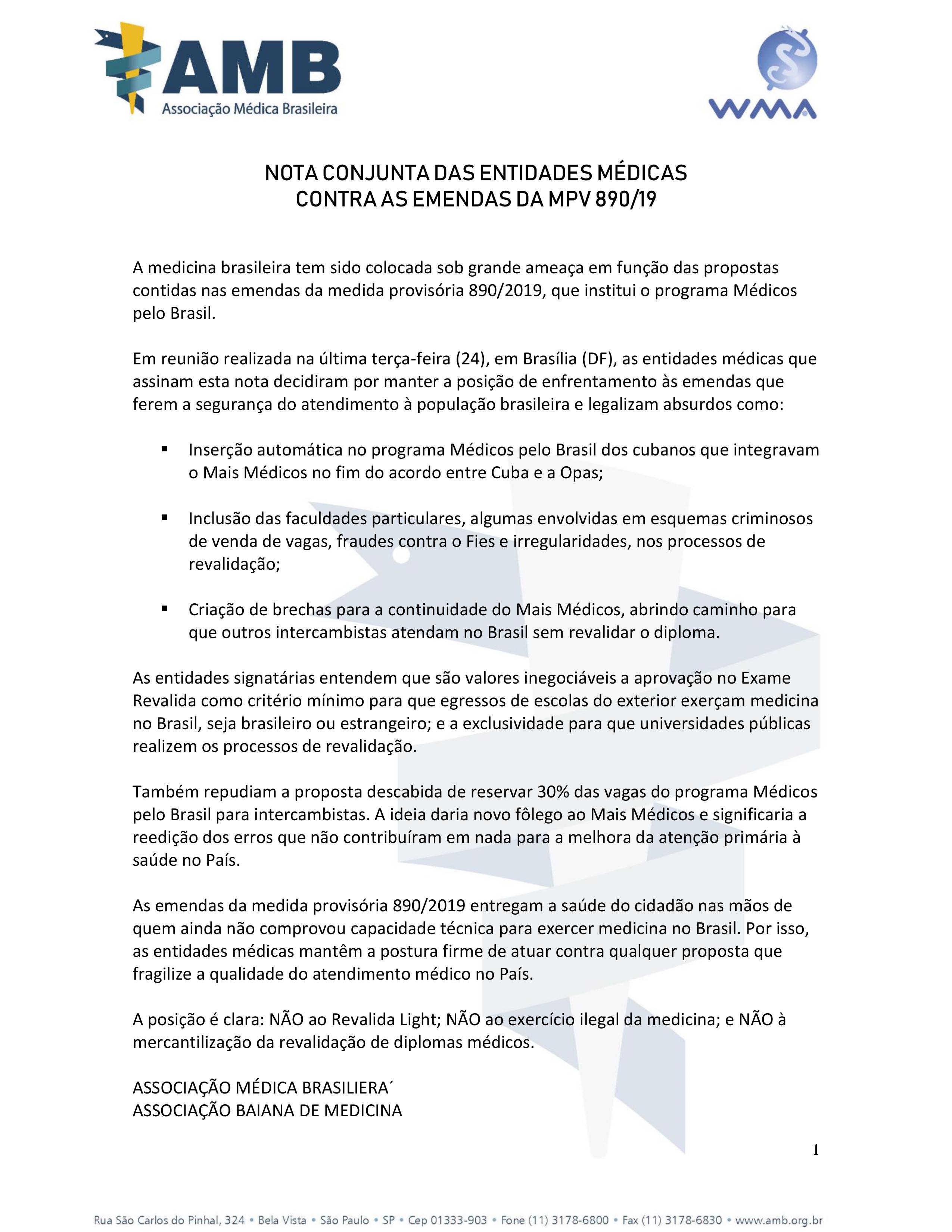 Nota conjunta das entidades médicas contra as emendas da MPV 890/19