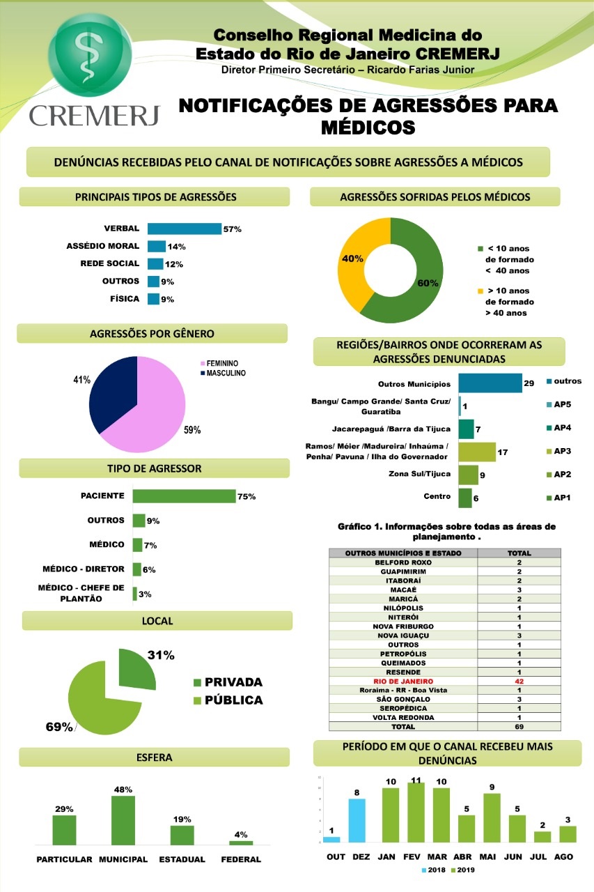 O CREMERJ fez um levantamento das notificações de casos de agressões a médicos, que foram recebidas de dezembro de 2018 a agosto deste ano. Na análise, fica claro que as mulheres foram as mais atingidas, sendo 59% dos episódios, enquanto os homens foram 41%.