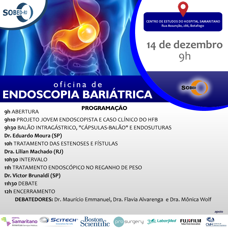 A SOBED-RJ realiza no dia 14 de dezembro, sábado, sua última atividade científica de 2019. O tema abordado será Endoscopia Bariátrica e o evento ocorrerá a partir das 9h, no centro de estudos do Hospital Samaritano, em Botafogo.