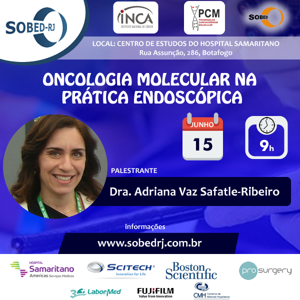 A SOBED-RJ realiza neste sábado, dia 15, a partir das 9h, sua sessão científica de junho, que abordará Oncologia Molecular na prática endoscópica. O evento ocorrerá no centro de estudos do Hospital Samaritano, em Botafogo, e tem entrada aberta a médicos.
