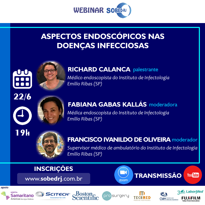 O evento terá início às 19h e abordará Aspectos endoscópicos nas doenças infecciosas. O palestrante será o Dr. Richard Calanca, médico endoscopista do Instituto de Infectologia Emilio Ribas (SP). A moderação ficará com a Dra. Fabiana Gabas Kallás, médica endoscopista, e com o Dr. Francisco Ivanildo de Oliveira, supervisor médico de ambulatório, ambos também do Instituto de Infectologia Emilio Ribas (SP).