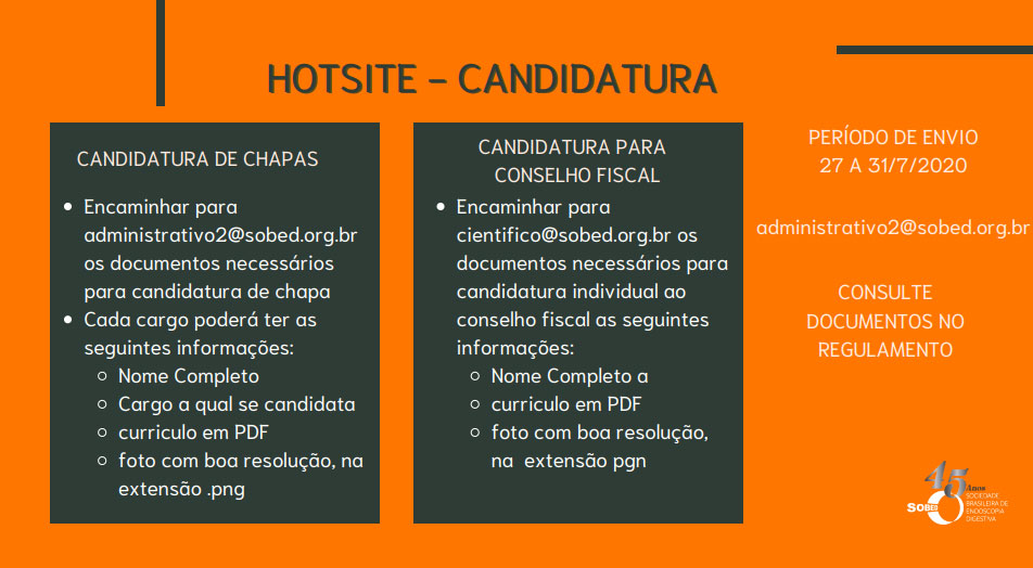 As inscrições das chapas para a Diretoria da SOBED-RJ serão aceitas de 27 de julho de 2020 até às 18h00 de 31 de julho de 2020, e deverão ser realizadas através do e-mail administrativo2@sobed.org.br aos cuidados de Michele Soares, com assunto: CANDIDATURA CHAPA – DIRETORIA SOBED-RJ, com o nome dos componentes de cada chapa, com a expressa referência aos cargos a que concorrem, incluindo, no caso das chapas para a Diretoria, seu programa de gestão societária, que deverá ser encaminhado ao Presidente da Comissão.