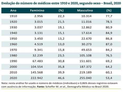 A crescente presença feminina na carreira médica é nítida ainda na evolução da distribuição por sexo ao longo do último século. Em 1910, os homens eram 77,7% e as mulheres, 22,3%. A presença masculina se amplia até 1960, quando chega a 87%, e as mulheres se limitam a 13%. A partir dos anos 1970, as mulheres ampliam sua participação e passam de 15,8% em 1970 para 46,6% em 2020.