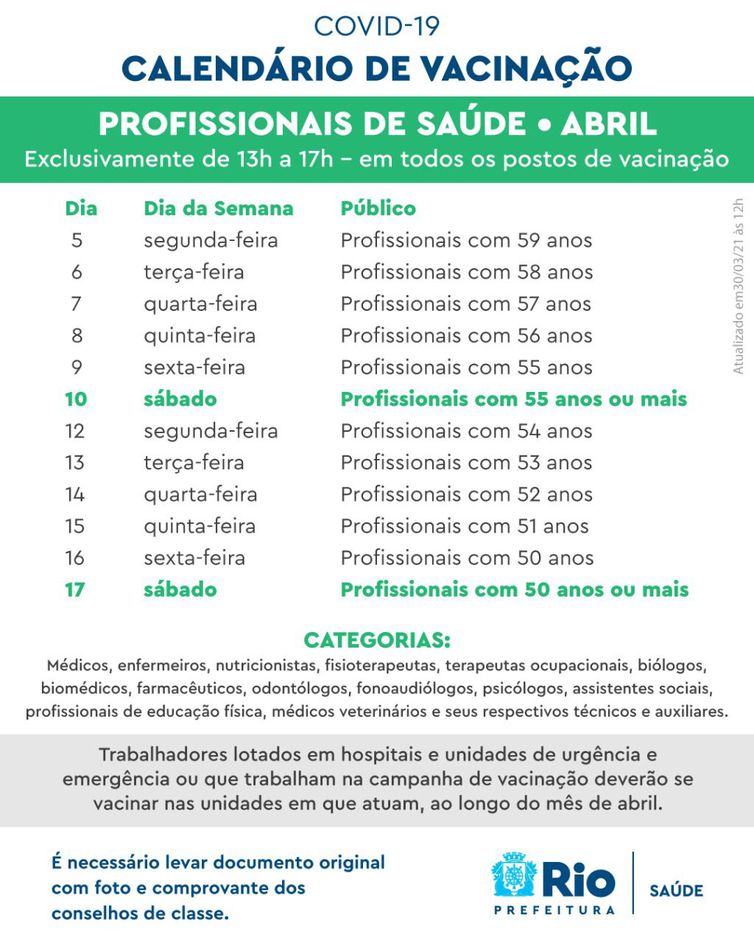 “Neste mês de abril também vamos avançar na vacinação dos profissionais de saúde. Os maiores de 50 anos poderão se vacinar na sua unidade de referência conforme calendário. Os demais vacinarão nas unidades em que trabalham”, disse Paes.