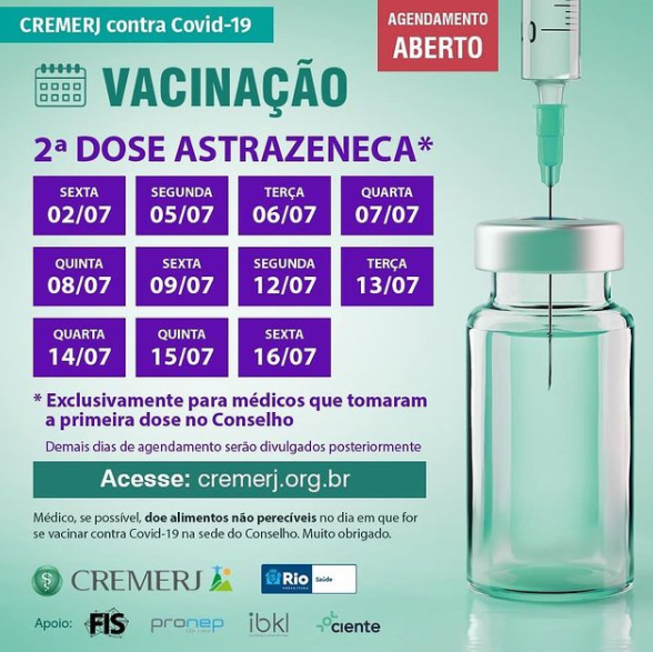 Está aberto o agendamento da segunda dose da campanha de vacinação do CREMERJ para os médicos do Rio de Janeiro. Poderão participar somente os profissionais que receberam a primeira dose de AstraZeneca na sede do Conselho. Esta etapa da campanha acontecerá de 02 a 16 de julho (exceto fim de semana), no mesmo local.… SAIBA MAIS