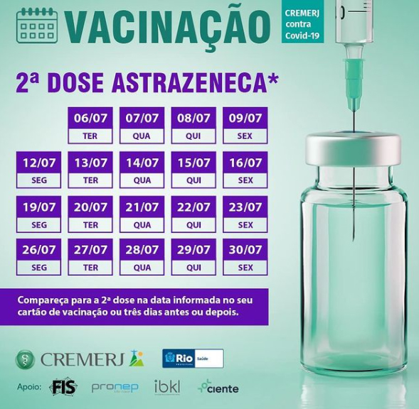 O Cremerj abriu novas datas para a aplicação da segunda dose da AstraZeneca em sua sede. O agendamento pode ser feito no site e poderão participar os médicos que já tomaram a primeira dose. A imunização acontecerá até o dia 30 de julho (exceto fins de semana).