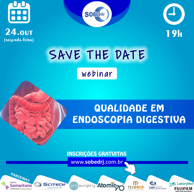 No dia 24, segunda-feira, a partir das 19h, ocorrerá a reunião científica de outubro da SOBED-RJ, cujo tema será Qualidade em Endoscopia Digestiva.