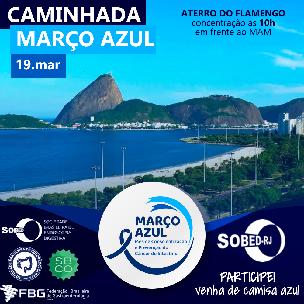A SOBED-RJ realizará uma caminha em prol da campanha Março Azul no dia 19 de março, domingo, no Aterro do Flamengo. A concentração será a partir das 10h em frente ao Museu de Arte Moderna (MAM).