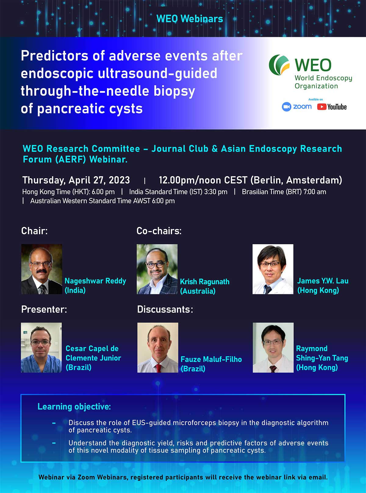 A Organização Mundial de Endoscopia (WEO) realiza nesta quinta-feira, dia 27, às 7h (horário de Brasília), webinar que abordará Cistos Pancreáticos.