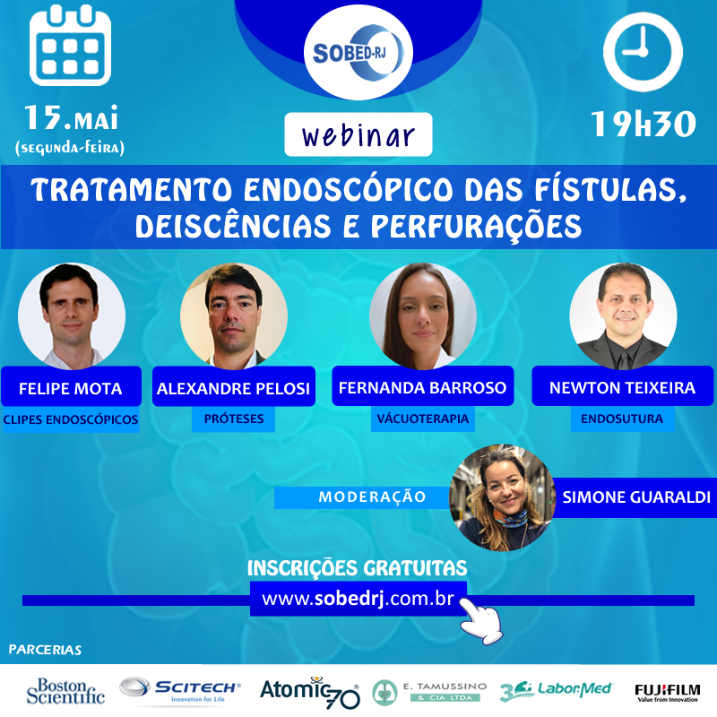 A SOBED-RJ começa suas atividades científicas em 2023 no dia 15 de maio, segunda-feira, às 19h30. A reunião científica online abordará Tratamento endoscópico das fístulas, deiscências e perfurações.