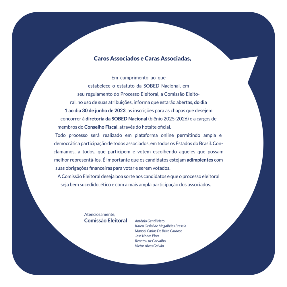 Este ano a SOBED Nacional abre o processo eleitoral para a Diretoria Nacional e Conselho Fiscal (Biênio 2025-2026).