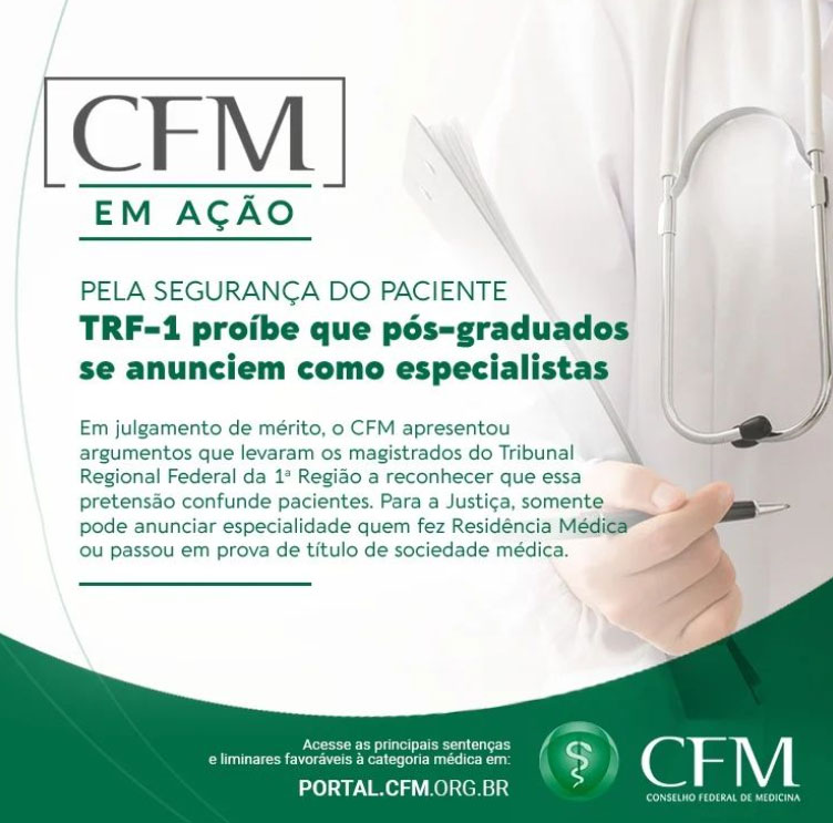 O Tribunal Regional Federal da 1ª Região (TRF1) acolheu argumentos do CFM e proibiu que médicos com pós-graduação se anunciem como especialistas. Dessa vez, foi em julgamento de mérito de ação civil pública proposta por uma associação de pós-graduandos.