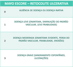 - O escore de Mayo é simples, fácil e o mais utilizado nos estudos. Como limitações, temos a falta de validação, a incapacidade de distinção entre úlceras superficiais e profundas e a classificação é baseada no segmento do cólon pior avaliado em atividade. Devemos, portanto, fazer uma conclusão mais descritiva utilizando o score de Mayo na conclusão de forma segmentar.