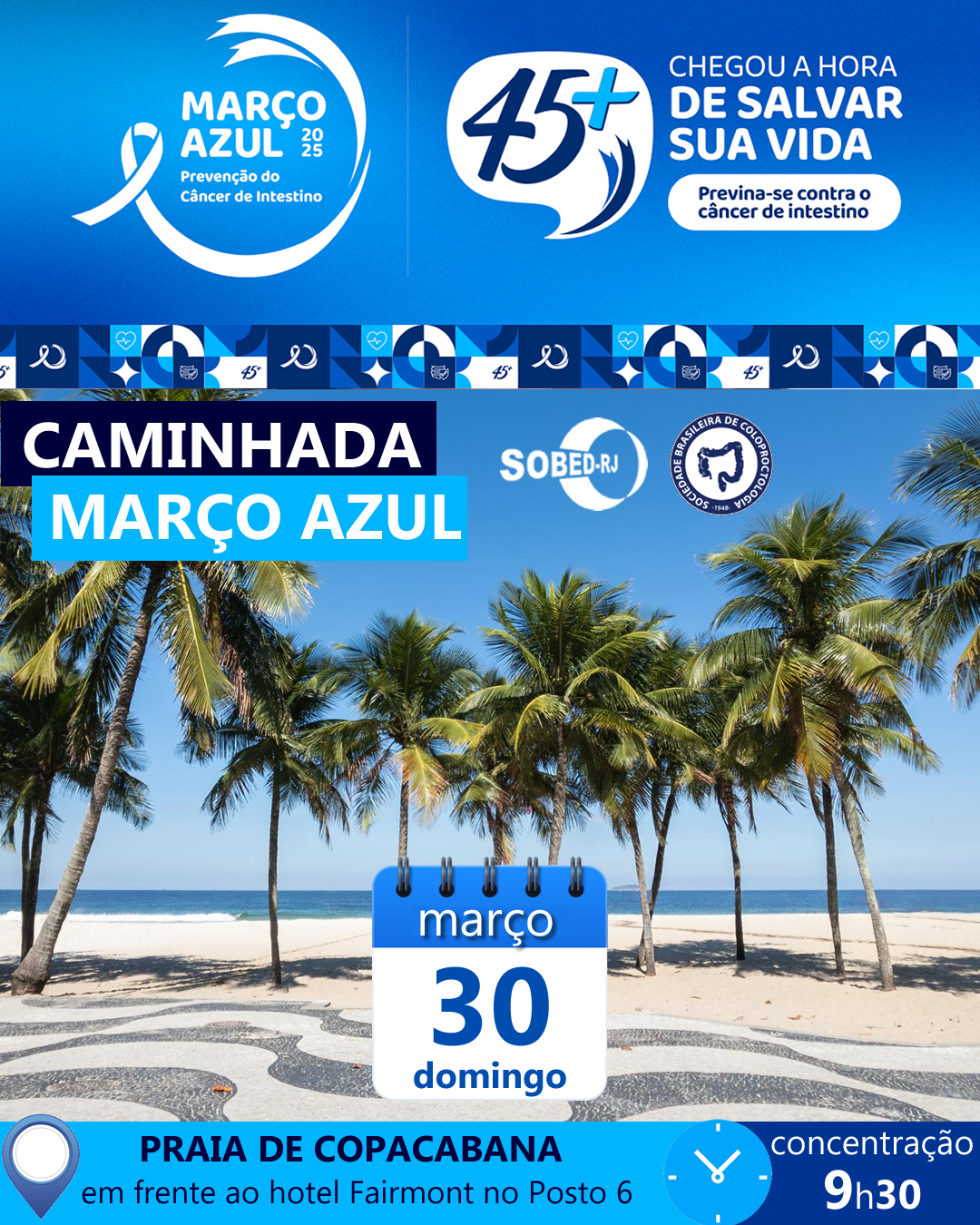 A SOBED-RJ e a Sociedade Brasileira de Coloproctologia realizarão uma caminhada em prol da campanha Março Azul neste domingo, dia 30, na praia de Copacabana. A concentração será a partir das 9h30 em frente ao hotel Fairmont, no posto 6.